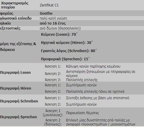 Στο Κέντρο Γερμανικών Τσιαλτζής προετοιμάζουμε για κάθε ένα από τα παραπάνω πτυχία του επιπέδου C1. Συνήθως αυτό που προτιμάται είναι το Zertfikat C1 του Goethe, για το οποίο και δίνουμε περαιτέρω πληροφορίες:
